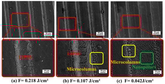 The preparation of the LIPSS structure is discussed in connection with scanning speed and energy density. When the scanning speed is kept at 40 mm/s, the energy density was changed by adjusting the amount of defocus and the laser spot diameter. The obtained surface structure is shown in Figure 6. In Figure 6a, it is observed that a significant LIPSS is generated on the scanning trajectory when the defocusing amount is 0.5 mm and the energy density is 0.218 J/cm2. The result is similar to the research of Kon et al. [46]. As the amount defocus increases to 1 mm, the energy density reduces to 0.107 J/cm2. In Figure 6b, the surface structure is composed of a periodic ripple structure and a microcolumns structure. However, the obtained structure is not distinct due to the decrease of laser energy density. Furthermore, when the defocusing amount increases to 3 mm, the energy density is 0.042 J/cm2. The microstructure of the scanning trajectory is composed of microcolumns and nanopillar structures, and no LIPSS is observed in Figure 6c.