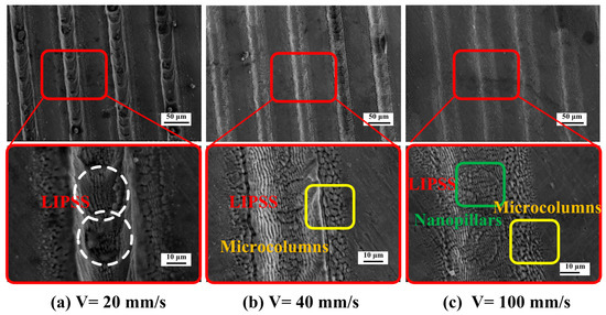 Figure 7 shows the effect of scanning speed on the morphology of the periodic structure. The defocus amount is controlled at 1 mm with the energy density of 0.107 J/cm2. Figure 7a shows the microstructure as the scanning speed is 20 mm/s. There are some splashing and redeposition of the molten material on the surface scanning trajectory. Its surrounding region and the obvious laser spot overlap trail can be seen from the trajectory in the partial enlarged view, which indicated by the white dashed box marked in the figure. As the scanning speed is slower and the number of pulses is larger, the cumulative energy is higher. Then, severe damage of LIPSS formed on the surface. Figure 7c shows the microstructure as the scanning speed is 40 mm/s. The periodic ripples are generated inside the scanning trajectory. The densely microcolumns are generated due to the lower energy density at the edge of the spot, which obeys the Gaussian distribution of the laser energy. Figure 7c shows the microstructure as the scanning speed is 100 mm/s. A small amount of periodic ripple structure and microcolumns structure exist inside and its edge of the scanning track. The obtained ripples are unclear, which means the surface cumulative energy density than the damage threshold of the material surface. Therefore, a clear and regular periodic ripple structure cannot be induced in the substrate surface.