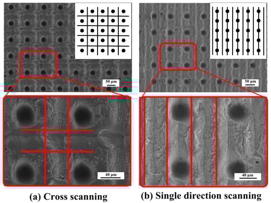 Finally, the micro/nano hierarchical structure is obtained on the Ti-6Al-4V surface by overlaying the periodic ripple structure on the prepared micro-dimple array structure without changing the laser source and the location of material. Figure 9 shows an SEM image of the hierarchical structure. The periodic ripple structure is distributed in the micro-dimple array and unablated regions uniformly, which exhibits a micro/nano hierarchical structure with typical characteristics. Moreover, different overlay ways were attempted to contrast the distinction between the obtained hierarchical structures. When the way of cross-scanning is adopted, the post-scan trajectory destroys the periodic structure formed by the first scan. Accordingly, the hierarchical structure (Figure 9b) prepared by the single direction lap method is more complete and clear. The complete overlapping of the scanning trajectory boundaries is achieved by adjusting the scan spacing and the spot size.