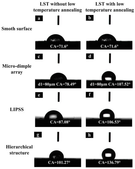 The relationship between the wettability of the textured surface and morphology of microstructure is investigated. The samples were divided into two groups, with or without the low-temperature annealing treatment. Figure 10 shows the contact state and contact angles of various laser textured surfaces with or without low-temperature annealing treatment. In Figure 10a,b, the contact angle of the smooth surface does not change after low-temperature annealing treatment. It indicates that the low-temperature annealing treatment has little effect on the wettability of the smooth surface. However, the contact angle of the textured surface treated by low-temperature annealing changed significantly. In Figure 10c,d, the contact angle of the surface with micro-dimple array increases from 78.49° to 107.52°. While the contact angle of the surface with LIPSS increases from 87.08° to 106.53° in Figure 10e,f. In Figure 10g,h, the contact angle increases from 101.27° to 136.79° when the surface of the micro-dimple array is covered by LIPSS. The contact angle reaches its maximum value.
