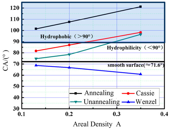 Comparing the CA of textured surfaces with theoretical values of Cassie model, it is found that the CA of the unannealed textured samples is lower than the theoretical value. The CA of the annealed textured samples is significantly larger than the theoretical value, which is due to the difference of surface element composition and content of the samples. The elements affect the distribution of surface free energy, which leads to the error between experimental results and theoretical values.