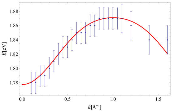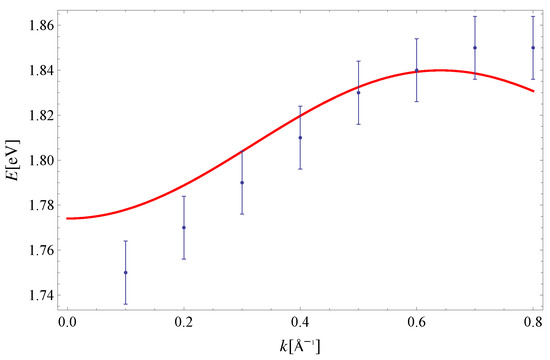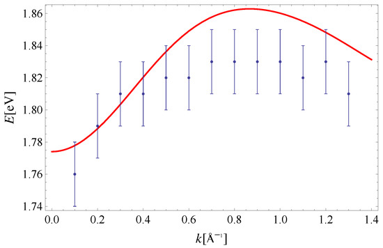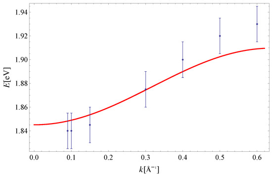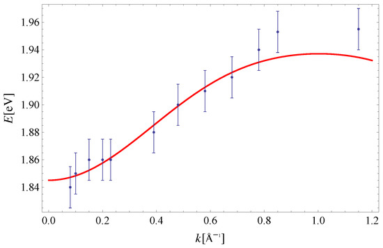 Exciton dispersion along the direction. Experimental data are taken from Reference [3]. The theoretical curve is obtained for: and the remaining parameters are the same as in Figure 2.