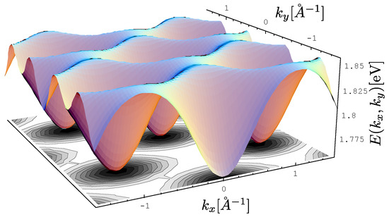 Bearing in mind the remarks on pentacene structure from the previous section, we obtain the Hamiltonian of Equation (2), adapted to the pentacene structure, which in the Bloch approximation is: