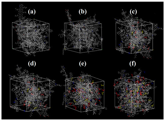 Models of asphalt systems: (a) asphalt; (b) aged asphalt; (c) 5% BRAA; (d) 10% BRAA; (e) 15% BRAA; (f) 20% BRAA.