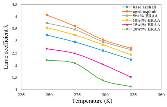 As shown in Figure 5, the lame coefficient λ of asphalt decreased with the increasing temperature. It is demonstrated that temperature could have an influence on the mechanical properties and change the asphalt internal structure. The lame coefficient λ of aged asphalt was the highest, and the λ of BRAA reduced with the increasing bio-oil content, exhibiting that aging could improve the stiffness of asphalt. But bio-oil would also weaken the resistance to elastic deformation. The lame coefficient λ of base asphalt, aged asphalt, 5 wt% BRAA, 10 wt% BRAA, and 15 wt% BRAA at 298 K were 2.60, 3.04, 2.96, 2.84, and 2.02, respectively. The lame coefficient λ of 10 wt% BRAA could decrease by 6.6%, while the lame coefficient λ of 15 wt% BRAA could decrease by 33.6%. The results indicated that the effect of bio-oil on the lame coefficient λ of asphalt was not linearly taking place. Over 15 wt% bio-oil would significantly reduce the resistance of asphalt to elastic deformation.