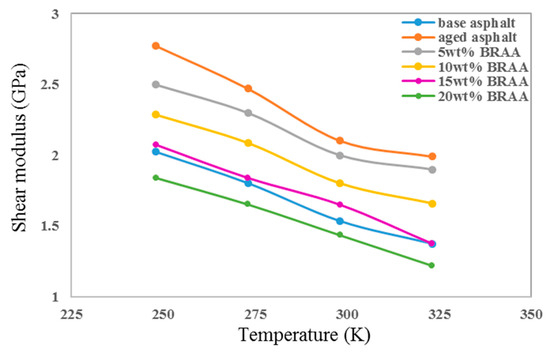 As can be seen in Figure 6, the shear moduli (G) increased after asphalt aging, while the G decreased with the increasing bio-oil addition amount. It indicated that the aging and bio-oil would have influence on the shear moduli. In addition, the G decreased with the increasing temperature, and the bio-oil also decreased the shear moduli of asphalt binder. As can be seen, shear moduli reduced in the order of aged asphalt, 5 wt% BRAA, 10 wt% BRAA, and base asphalt. It indicated that the flexibility of the asphalt decreased after aging, and the bio-oil could recover this change to some extent. The shear moduli of BRAA were close to those of base asphalt when the content of bio-oil reached 15 wt%. The G of 20 wt% BRAA was even lower than that of base asphalt.