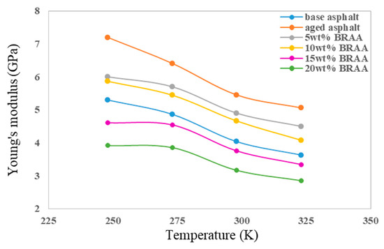 As shown in Figure 7, the Young’s moduli (K) were calculated according to λ and G at different temperatures. The Young’s moduli of aged asphalt were highest, and decreased with the addition of bio-oil, while the K of 5 wt% BRAA and 10 wt% BRAA were bigger than that of base asphalt. The results showed that Young’s modulus of asphalt increased by 35.2% after aging at 298 K, and adding 5 wt% bio-oil could decrease the Young’s modulus of aged asphalt by 10.0%. Bio-oil of 15 wt% could restore the K of aged asphalt restore to its original level.