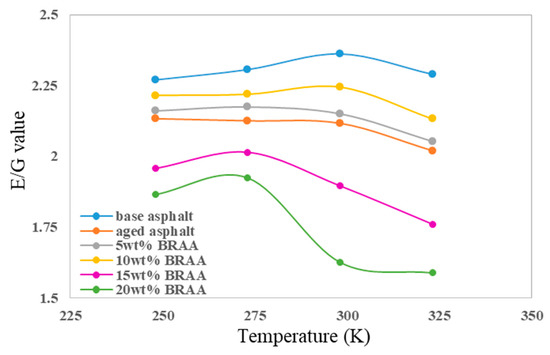 The ratio of bulk modulus to shear modulus (E/G) was used to estimate the brittle or ductile behavior of the material. High E/G values represent ductility, while low E/G values represent brittleness. The critical value for separating tough and brittle materials is about 1.75. As shown in Figure 9, calculated E/G value indicated that the base asphalt was ductile. The E/G value of asphalt decreased after aging. The addition of 5 wt% or 10 wt% of bio-oil could recover the ductility of aged asphalt to some extent. The E/G values of base asphalt, aged asphalt, 5 wt% BRAA, and 10 wt% BRAA were 2.361, 2.116, 2.159, and 2.244, respectively. The results showed that the ductility of asphalt decreased by 10.4% after aging, and 10 wt% bio-oil could improve the ductility of aged asphalt by 6.0%. However, 15 wt% bio-oil would further decrease the ductility of aged asphalt. On the other hand, base asphalt had the highest E/G value at 298 K. With the addition of bio-oil, the highest E/G value temperature reduced, which indicated that bio-oil would decrease the temperature stability of asphalt.