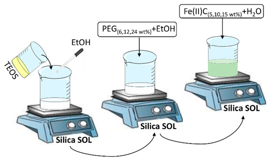 The hybrid materials with different percentages of polyethylene glycol (PEG, MW = 400, Sigma-Aldrich, St. Louis, MO, USA) and Fe(II)C were synthesized by sol-gel method. Tetraethyl orthosilicate (TEOS; Si(OC2H5)4; Sigma-Aldrich, St. Louis, MO, USA) was used as precursor of silica matrix and it was added in a solution of 99.8% ethanol (EtOH, Sigma-Aldrich, St. Louis, MO, USA) and distilled water. In this study the molar ratios of solution were equal to H2O/TEOS = 26.6 and EtOH/TEOS = 6.