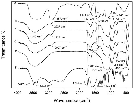 FTIR analysis is considered as an appropriate method to study the interactions in the hybrid materials. The typical bands of silica matrix and polymer are visible in the hybrids’ spectra which are shown in the Figure 2 (curve b–d). The asymmetric and symmetric Si–O–Si stretching, and bending vibrations of the silica are attributed to the band at 1080 cm−1 with a shoulder at 1200 cm−1 and the peaks at 800 cm−1 and 460 cm−1, respectively [22,23]. Furthermore, in the hybrid spectra, it is possible to observe a slight shift toward lower wavenumbers of the Si–OH bond vibrations and O–H stretching compared to pure SiO2 (curve e) from 960 to 955 cm−1 and from 3450 to 3440 cm−1 [24,25], suggesting that an interaction between silica matrix, PEG and Fe(II)C occurred.