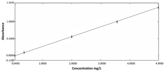 The calibration curve was determined by taking absorbance versus concentration between 0 and 4.99 mg/L as parameters. For this interval, the calibration curve fits the Lambert and Beers’ law [20]