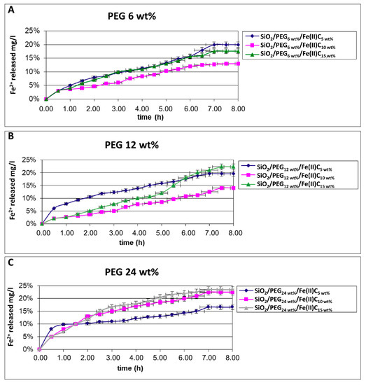 In the release plots (Figure 4A–C) of SiO2/PEG(6, 12, 24 wt%)/Fe(II)C(10 wt%) and SiO2/PEG(6, 12, 24 wt%)/Fe(II)C(15 wt%) the presence of the different percentages of polymer modified the Fe2+ release curves, unlike the hybrids with Fe(II)C(5 wt%). The PEG amount equal to 24 wt% (Figure 4C) determines a greater release of the Fe2+ compared to another one, probably due to the formation of the silica/PEG network. In particular, when the content of PEG and Fe(II)C is higher in the hybrids, a part of it cannot form H-bonds because all hydroxyl groups of silica are already involved in H-bonds. Probably, the formation of few weak bonds between Fe(II) and silica-PEG matrix allow the greater release of Fe2+ [30,31,32].
