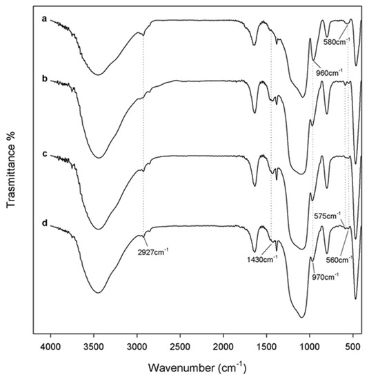 The bioactive materials are able to form an apatite layer on their surfaces in the living body, allowing the bond to living bone. The presence of various functional groups on materials surface induce the hydroxyapatite formation. In this regard, the hybrids were soaked in SBF for 7, 14 and 21 days to evaluate their bioactivity [21]. In particular, the interaction of Si–OH groups on the hybrids’ surface with the Ca2+ ions present in the fluid allow to the hydroxyapatite nucleation and leading to an increase of positive surface charge. The formation of amorphous phosphate is induced by the combination of the Ca2+ ions and negative charges of the phosphate ions, which spontaneously transforms into hydroxyapatite [Ca10(PO4)6(OH)2] [33]. The FTIR was used to identify the typical peaks of hydroxyapatite layer on materials surface (Figure 5). All hybrid materials showed the same results independently of PEG and Fe(II)C content. The displacement of Si–OH band, from 960 to 970 cm−1 suggested the interaction of the hydroxyapatite layer with the –OH groups of the silica matrix. Furthermore, comparing the hybrid materials spectra (Figure 5 curve) after 21 days in SBF with those of the same materials not soaked in SBF (Figure 5 curve a), the split of the band at 580 cm−1 in two new ones at 575 and 560 cm−1, was visible. The presence of these new bands is caused by the formation of the hydroxyapatite precipitate, in particular, and are due to the stretching of the hydroxyl groups of hydroxyapatite and the vibrations of the P groups [34,35]. Moreover, the peak related to citrate at 1430 cm−1 attributed to COO− group, undergoes change in the intensity that might be due to the interaction with the hydroxyapatite layer.
