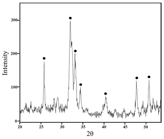 Furthermore, XRD measurement was used to identify the presence of hydroxyapatite on the hybrids’ surface. The intense peaks of hydroxyapatite crystalline are visible in Figure 6(●), confirming that the materials surface is covered by hydroxyapatite layer after 21 days in SBF. Moreover, this result suggest that the hydroxyapatite layer is very thick to detect XRD signals from hybrids’ surface [21,36].