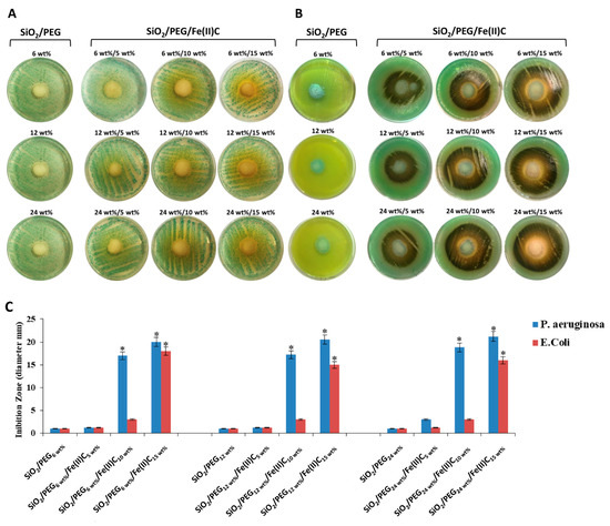 In order to evaluate the effect of the hybrids on the microbial growth, E. coli and P. aeruginosa were used. The different materials were grinded in a mortar to obtain powders. Both bacteria were inoculated in absence and in presence of the 100 mg of hybrids’ powders. The zones of inhibition formed by the materials without Fe(II)C and containing different amount of Fe(II)C against E. coli are shown in Figure 7A. It is possible to observed that the materials exhibited mild activity against E. coli, only the SiO2/PEG6 wt%/Fe(II)C15 wt% hybrid induces the inhibition halo around the synthesized hybrid Figure 7C. These results suggest that the microbial growth was inhibited by higher amount of Fe(II)C and by low percentage of PEG. When the P. aeruginosa was inoculated in presence of all the hybrids, the inhibition halo was more visible (Figure 7B). In particular, the diameter of zone of inhibition (Figure 7C) increases with 10 and 15 wt% of Fe(II)C, independently of the polymer content. Furthermore, the pigmentation reddish brown of P. aeruginosa inoculated with the hybrids containing Fe(II)C is observed (Figure 7B). In literature is reported that P. aeruginosa is able to produce a range of pigments under certain growth conditions [37,38,39]. Probably, the pigmentation reddish brown it is due to the production of pyomelanin which is involved in iron reduction and acquisition [40], resistance to oxidative stress [41] and virulence [38]. The pyomelanin could be produced by the release of Fe2+ from hybrids as this phenomenon is not observed with materials without Fe(II)C. Finally, in the Figure 7C are reported the inhibition zones of E. coli and P. aeruginosa. Comparing the diameter of the inhibition zones of the different hybrids, the better antibacterial activity against P. aeruginosa was observed.