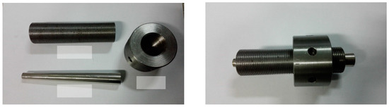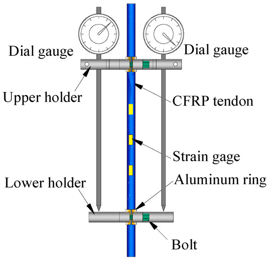 To measure the strain of the specimen over a long observation period, a dedicated device was used as shown in Figure 4. This device contains an upper holder, a lower holder, and two dial gauges. Both the upper holder and lower holder were divided into two symmetric parts which were connected and fixed to the tendon by bolts. As the CFRP tendon has a low transverse strength, two aluminum rings were installed between holder parts to wrap the tendon to prevent the specimen from being damaged by the extrusion force. The distance between the upper holder and lower holder was 220 mm and the dial gauges had a precision of 0.001 mm. So, the precision of this measurement device was calculated to be A = 0.001/220 = 44.5 × 10−6 = 4.5 με. To verify the reliability of this device, three strain gauges were attached to the middle of the first specimen. The data obtained from both the device and the strain gauges were recorded during the loading process. The comparison showed that the deviation between these two data sets was less than 5%, demonstrating the efficiency of this strain measurement device.
