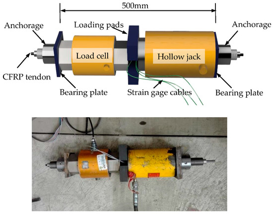The static tensile strength test setup consists of a hollow jack, a load cell, bearing plates, and loading pads, as shown in Figure 2. Three strain gauges were attached to the middle of each tendon to measure its strain. The original load and strain data were captured by a data acquisition instrument. All the specimens were loaded to failure, and the data of five specimens which did not fail at the anchorage zone were picked out to determine the static tensile strength.