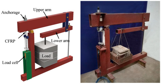 To maintain the load stability during the creep test on CFRP tendons, a test frame was designed and fabricated for this study (Figure 3). The frame was able to magnify the applied load by a factor of 56 through the application of the lever principle. A screw was installed at the end of the lower arm to adjust the alignment of two horizontal arms. The precise load applied to the CFRP tendon was measured by a load cell that was set at the anchorage zone.