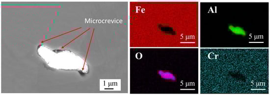 Inclusions in the steel were analyzed by FE-SEM-EDS prior to etching. As shown in Figure 1, Al2O3 inclusions existed in the steel. This result is consistent with the SEM-EDS observations in Al-killed alloyed steel []. The size of Al2O3 inclusions ranged from 2 to 7 μm. Some microcrevices were observed at the matrix–inclusion interfaces (Figure 1), which was mainly due to the differences of the strain values [,] and coefficients of thermal expansion []. Similar microcrevices have been observed in previous investigations [,,,].