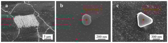 After analyzing the inclusions in the steel, the sample was etched with a 4% Nital solution. As shown in Figure 2, the microstructures in the steel were pearlite and ferrite (Figure 2a). Two different types of nanoscale inclusions were observed in the steel: MnS (Figure 2b) and Al2O3–MnS (Figure 2c). Their composition is shown in Table 1, and the size of these nanoscale inclusions ranged 100–500 nm.