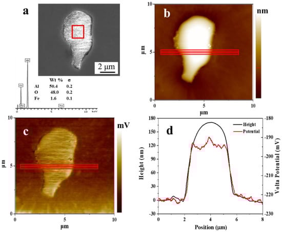 SKPFM measurements were conducted to obtain abundant information regarding the electrochemical characteristics associated with the local surface inhomogeneities. Figure 3 shows the FE-SEM image and EDS result (Figure 3a) accompanied by the AFM topography map (Figure 3b), and SKPFM Volta potential map (Figure 3c) of an Al2O3 inclusion. A line profile analysis result of the AFM/SKPFM images is shown in Figure 3d.