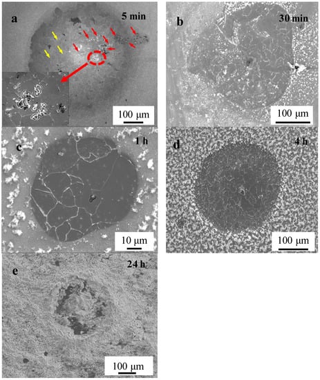 The morphology of localized corrosion on specimens after immersion test: (a) 5 min; (b) 30 min; (c) 1 h; (d) 4 h; and (e) 24 h.