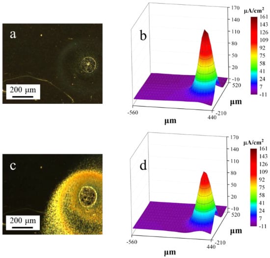 Figure 5 shows the in situ optical images and the corresponding ionic current maps obtained from the SVET measurements. As shown in the optical images in Figure 5a, a clear corrosion spot was formed due to the localized corrosion after being immersed for 5 min. In the corrosion spot, a high anodic corrosion current was detected in the corresponding current map (Figure 5b). The current density peak in the corrosion spot was about 160 μA/cm2, with the pre-corroded area as the anode and the originally uncorroded electrode as the cathode. As shown in Figure 5a, a light-yellow circular band area was observed around the corrosion spot. This area resulted from the drifting of the corrosion product from the center of the spot to the outside. Figure 5c shows the morphology of the corrosion spot after 30 min immersion. The shape of the corrosion spot in Figure 5c was similar to that in Figure 5a. The surfaces of both the pre-corroded and the uncorroded areas around the corrosion spot were covered with corrosion products. The current density peak in the center of the corrosion spot was 129 μA/cm2 (Figure 5d).