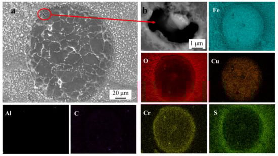After the SVET test, the corrosion product on the sample was observed by FE-SEM-EDS. Figure 6 shows the SEM image and the corresponding EDS maps of the corrosion spot. An inclusion was present in the corrosion spot, with the corrosion product covering the pit (Figure 6b). This led to the formation of occluded cells with the pits acting as anodes. The EDS maps demonstrated that Fe, O, and S distributed on the entire surface. Moreover, Cu and Cr were found to be enriched on the surface inside the corrosion spot.
