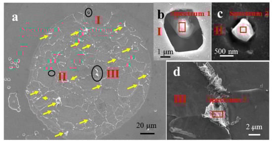 (a) SEM image of the corrosion spot after removing the corrosion product; (b) inclusion in position I; (c) nanoscale inclusion of position II; and (d) pearlite in position III.