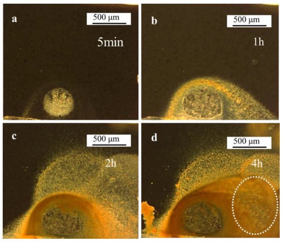 A 4-h SVET test was conducted to track the propagation of the corrosion spot. As shown in Figure 8a, after immersed in solution for 5 min, a clear corrosion spot covered with rust was observed on the sample surface. After 1 h, the corrosion spot grew larger, and the rust diffused to adjacent areas around the spot (Figure 8b). As the immersion time increased to 2 h, area covered with rust increased obviously (Figure 8c). The color of the rust covered around the boundary of the corrosion spot was deeper than relatively remote areas (Figure 8c), indicating the rust in the deep color area was much thicker. After being immersed for 4 h, the deep color rust covering area extended much further than previously (Figure 8d). In the area marked with a white circle (Figure 8d), some smaller corrosion spots could be observed with thinner rust covering them. The surface of the corrosion spot bottom was rugged. In the early stage of corrosion process, localized corrosion occurred in the smaller test area, and the adjacent steel around the corrosion spot was uncorroded (Figure 8a). With the floating diffusion of the rust generated from the corrosion area, the adjacent area started to be covered by the rust. Subsequently, corrosion initiated at these areas.