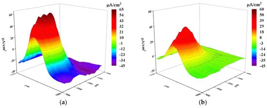 SVET (Scanning Vibrating Electrode Technique) measures the local ionic current by scanning about 100 µm above a sample surface with a vibrating probe. It picks up small potential variations between the probe and a reference electrode at certain frequencies with a lock-in amplifier filtering out electrical noise and subsequently converts the potential difference into an ionic current density by using Ohm’s law. The SVET instrument was manufactured by Applicable Electronics, LLC (Sandwich, MA, USA) and controlled by the ASET 2.10 program developed by Science Wares, Inc (Sandwich, MA, USA). A 20 μm diameter platinum black sphere was electrodeposited on the tip. The microelectrode vibrates in two directions, one parallel (y axis) and the other normal (z axis) to the sample surface, sensing the electric field in the two directions; however, in corrosion, the signals for the x vibration are seldom used. Further details can be found in the literature [,]. In the SVET test, an about 1–4 mm2 area was selected to track the micro-electrochemical signal. To ensure the conveniences of measurement, the sample surface was covered with paraffin to isolate unmeasured face and solutions.