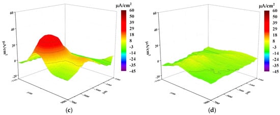 Figure 9 shows the ionic current change during the 4-h SVET test. At 5 min (Figure 9a), the corrosion current was the highest. There was a significant current difference between the corrosion spot and the adjacent area (Figure 9a). The peak current in the corrosion spot decreased over time (Figure 9b–d), and the current difference decreased simultaneously. As shown in Figure 9c, anodic current covering area increased compared with Figure 9a. At 4 h, the anode current decreased to the minimum, while the current of anode corrosion covering area peaked. This can be explained by the shield effect of the rust covered on the surface.