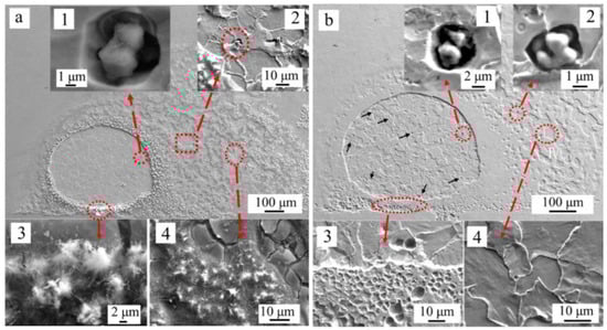 The morphologies of the corrosion area before and after removing rust are shown in Figure 10. As shown in Figure 10a, a large amount of rust covered around the corrosion spot. Some pits around inclusions were observed inside the corrosion spot (Figure 10(a1)), and some pits initiated around inclusions were also observed in the rust covered area slightly away from the corrosion spot (Figure 10(a2)). Some needle-like and cotton-like rust was formed at the boundary (Figure 10(a3)) of the corrosion spot or in the adjacent area (Figure 10(a4)). After the rust was removed, a clear corrosion spot was observed on the sample surface. Some pits initiated around inclusions was observed inside the corrosion spot (Figure 10(b1)) and in the adjacent area from the corrosion spot (Figure 10(b2)). Moreover, some smaller pits marked with black arrows could be observed inside the corrosion spot (Figure 10b). Figure 10(b3,b4) show the matrix in the rust covered area was also dissolved. As shown in Figure 10(b4), the grain was dissolved obviously. This indicated that corrosion form was transformed to uniform corrosion from localized corrosion after 4 h immersion.
