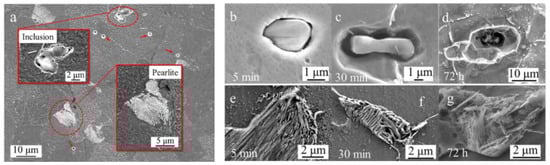 Meanwhile, pearlite played a different role in the evolution process of localized corrosion. The typical morphology of pearlites in samples after immersion of 5 min, 30 min and 72 h are shown in Figure 11e–g. After 5 min, the pearlite started to dissolve, but the lamellar Fe3C was not obvious. After 30-min immersion, the pearlite was dissolved and the lamellar Fe3C was obviously observed on the sample. When the immersion time reached 72 h, the boundary of the lamellar Fe3C started to dissolve. During the corrosion developing process, the ferrite in and around the pearlite dissolved without forming deeper pits.
