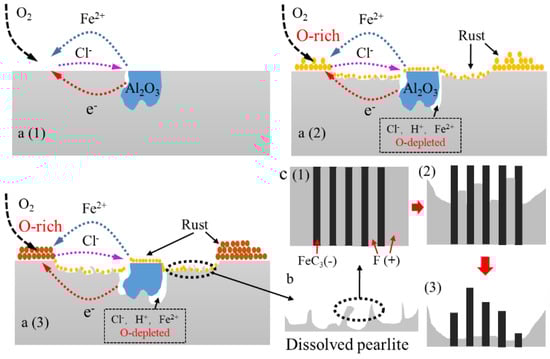 Pits easily formed around the Al2O3 inclusions. Due to the existence of microcrevices, aggressive ions enriched easily in microcrevices (Figure 12(a1)). Crevice corrosion may be formed as a result of the direct exposure of the boundary between the inclusion and the matrix to the aggressive environment [], which results in localized corrosion (Figure 6b and Figure 10a) []. Moreover, the SKPFM result indicates that the matrix with a lower potential was a vulnerable area, which can be easily attacked in the corrosion process []. Corrosion products such as Fe2+ spread around from the pits, and aggressive ions such as Cl− spread to the pits from further away. Cl− has a tendency to accelerate localized corrosion result from it accumulating inside the catalytic-occluded cells to maintain electroneutrality []. This ion migration cycle can maintain the corrosion reaction (Figure 12(a1)). The electrons generated in the reaction can transfer through the matrix.