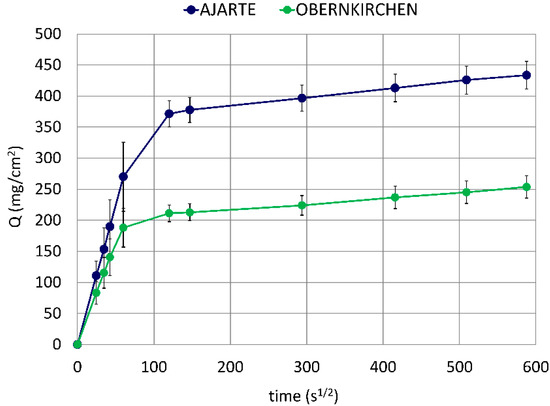 Ajarte and Obernkirchen are highly porous stones (23.5 and 24.1 vol%, respectively) with different mineralogical and microstructural properties [36,37,43]. (These latter properties are recalled in Table S1 in Supplementary Materials). Ajarte has an almost purely calcitic composition (93.4 mol%) and a low average pore diameter (0.17 μm), whereas Obernkirchen consists mainly of quartz (89.6 mol%) and displays a considerably higher mean pore size (0.76 μm). Although both stones exhibit very close values of open porosity, the suction power and velocity of their capillary networks are remarkably different: Ajarte absorbs water to a far greater extent and at a faster rate than Obernkirchen (Figure 2), which is probably due to differences in pore shape and connectivity.