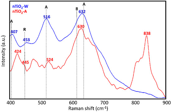 Raman spectra of dry TiO2 dispersions (nTiO2-W and n-TiO2-A) with indication of peak positions for anatase (A) and rutile (R) crystals.