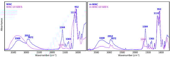 μ-FTIR spectra (ATR mode) of WNC and m-WNC films on glass slides before and after UV ageing for 600 h.