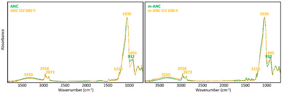 μ-FTIR spectra (ATR mode) of ANC and m-ANC films on glass slides before and after UV ageing for 600 h.