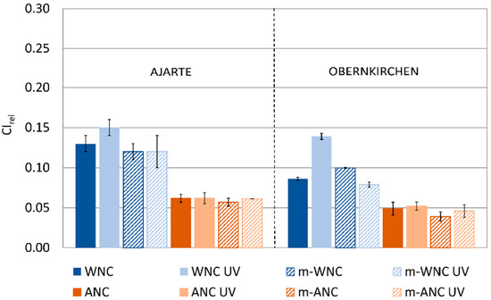 CIrel values of Ajarte and Obernkirchen stones treated with WNC, ANC, m-WNC and m-ANC before and after UV ageing for 600 h.