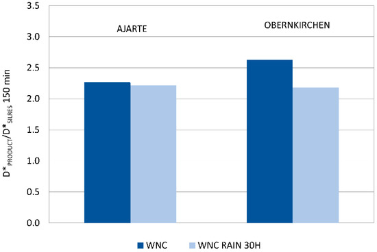 Ratio of discolouration values (D*) of WNC (D*PRODUCT) and corresponding values for the reference non-photocatalytic product Silres BS 290 (D*SILRES) at 150 min irradiation for Ajarte and Obernkirchen stones after rain ageing for 30 h.