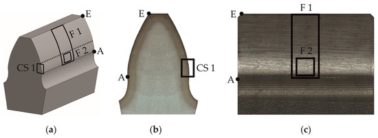 Areas of interest: (a) Three-dimensional scheme; (b) Cross-section; (c) Front view of the flank. CS: Cross-section; F: Flank; A: Used tooth root diameter; E: Tooth tip.