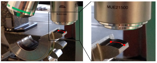 In order to determine the fatigue-related wear on the tooth flank, the profile form deviation of the gears was determined by a Klingelnberg PNC65 CNC-controlled gear measuring machine (Klingelnberg AG, Zurich, Switzerland). The profile form deviation is defined as the difference between the worn flank and its initial state. The area of interest F1 is given in Figure 2. An autofocus measuring device, by Alicona Imaging GmbH (Raaba/Graz, Austria) is used to generate a microscopic image of the tooth flank, as is presented in Figure 3, in order to document the temporal development of the surface of the tooth flank.