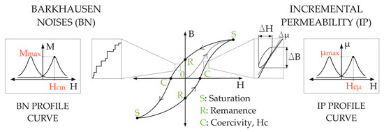 The micro-magnetic tests, based on the cyclic magnetization of a ferromagnetic material, were carried out on the area of interest F2, shown in Figure 2. The applied magnetic field strength H, the magnetic flux density B, also known as magnetic induction, and the magnetization M which is the vector sum of the magnetic moments of all the atoms of the material in a small volume, are related to each other with the magnetic constant or permeability of free space μ0, through Equation (1) [10].