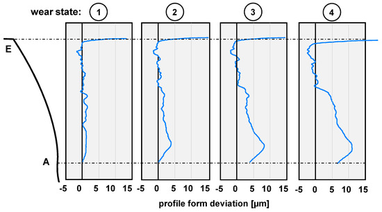 The following results were obtained from the non-destructive and destructive tests performed on the gear teeth, between the points A and E along the flank F, as defined in Figure 2. In Figure 5, the results of the profile form deviation measurements are given for a single tooth of each gear flank. In the wear state 2, a first local material removal starting at the tooth root with a depth of 4 μm appears. The maximum amount of wear continuously increases to 12 μm in wear state 4. Additionally, the local wear also grows to the pitch point.