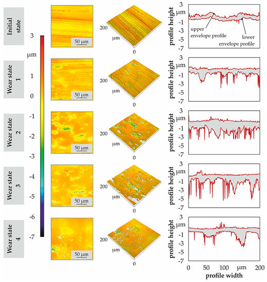 Figure 7 shows the surface topography of exemplary areas of 200 µm × 200 µm of the teeth, taken in the area F1 of Figure 2, for the initial ground surface and the different wear states. The upper and lower envelope profiles of surface topography describe the wear progress in dependence of loading states. By means of upper envelope profile, the flattening of the grinding marks with the formation of running tread surface is clearly recognizable. The simultaneous process of occurrence of micro-pitting is easy to distinguish on the lower envelope profile.