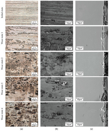 The microscopic analysis by means of light and scanning electron microscope, presented in Figure 8, describe the evolution of wear progress on the contact surface. The initial state is the characteristic surface finishing for these components after manufacturing, where some striations can be noticed along the grinding direction. No cracks were indicated in cross-sections, but the surface imperfections are susceptible areas for crack initiation after 3 × 105 cycles of load. On the subsequent wear states, due to the strain gradient during the different load conditions, so-called “frosted” areas appear, as well as the micro-spalling associated with the pitting, according to Reference [22]. The size and amount of spalls increase under higher load cycles, as well as the size and amount of cracks. These results are consistent with the profile form deviation (Figure 5) and the topography (Figure 7) investigations of the surfaces. The changes in the profile geometry can be explained and evidenced from a microscopical point of view as a sum of the before described defects over the whole surface.