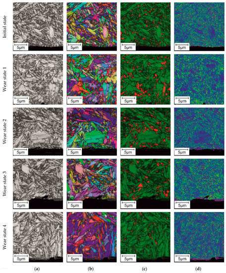 The dark areas in Fit-maps (Figure 9a) indicate the distorted crystal lattice, and therefore, the grain boundaries and areas with high deformation become well recognizable. Due to its strongly distorted bcc-lattice, the former retained austenite transformed into martensite can be indicated by dark areas in Fit-maps. The Inverse Pole Figure (IPF)-map (Figure 9b) is a representation of the different orientations of the crystal lattice, and the Phase-map (Figure 9c) indicates the phases; therefore, it is possible to characterize the austenite amount and its transformation in dependence of wear progress. The Phase-map reveals also the quantitative transformation of retained austenite into martensite, given as a graph in Figure 10. The Kernel Average Misorientation (KAM) (Figure 9d) quantifies the average misorientation around the measurement points of the maps, with respect to the first nearest neighbour. As expected, bigger misorientations are present at the grain boundaries equivalent to the information presented in Fit-maps. No correlation of wear progress and increase of deformation were detected.