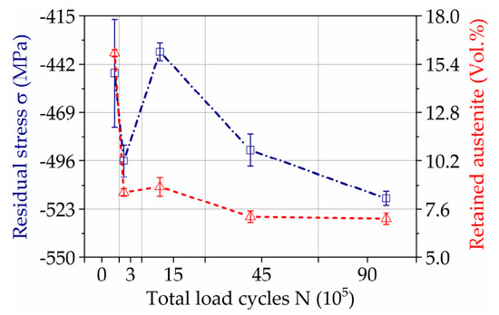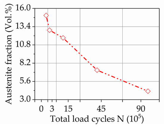 The coercive magnetic fields Hcm and Phicm acquired by Barkhausen noise analysis (Figure 12b) show high sensitivity to the development of the residual stresses and correlates with the amount of retained austenite (Figure 11). The sudden drop of the coercive magnetic field after 3·× 105 cycles follows the general trend of coercivity presented in Figure 12a, mainly caused by cracks formation and austenite transformation. By following wear conditions, a further decrease of the retained austenite and of the compressive residual stresses occurs, leading, according to References [26,27,28,29], to increasing of the coercive field force Hcm and Phicm. The further decrease of both parameters indicates the strong concurrent influence of crack formation, as it was detected by coercive field force Hcµ.