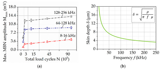 To assess the properties at different depths, the micro-magnetic tests were carried out using different ranges of bandpass frequencies. The electromagnetic signals of certain frequency pass through the electrically conducting material and are attenuated by eddy current damping, in a way that the amplitude of the field at a skin depth, δ, decays to 1/e (around 37%) of its value at the surface [15]. With this concept, it is possible to compute the skin depth effect using Equation (2), which has been widely used in many works [16,17].